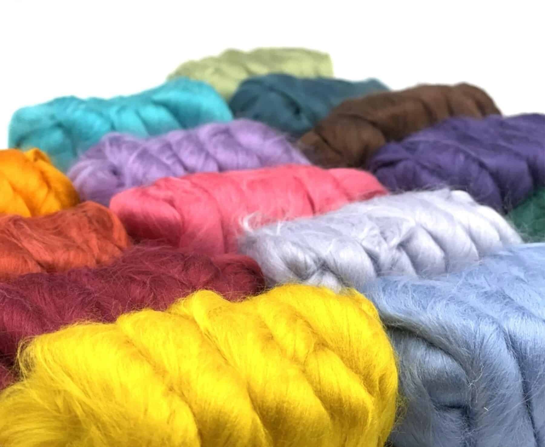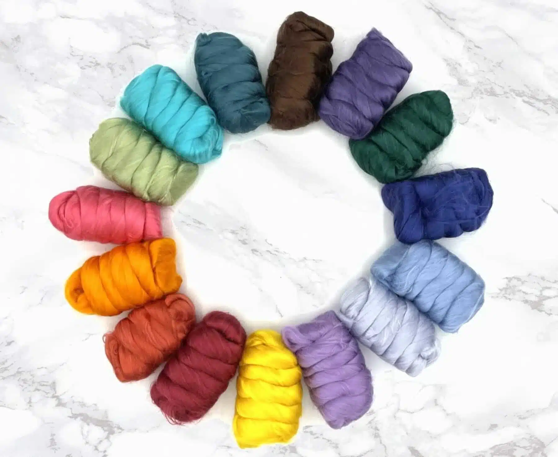 Ce paquet contient une collection de 15 magnifiques couleurs chaudes de fibres de mèche fabriquées à partir de bambou à 100 %.